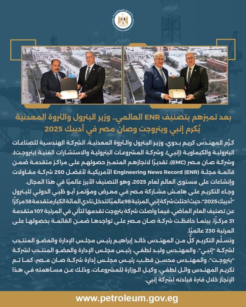 وأكد الوزير خلال التكريم أن ما حققته الشركات الثلاث يعكس ما يتمتع به قطاع البترول المصري من كفاءات هندسية وفنية قادرة على المنافسة عالميًا، مشيرًا إلى أن هذه النجاحات تأتي في إطار استراتيجية الوزارة لتعزيز الحضور الإقليمي للشركات الوطنية ودعم قدرتها على تنفيذ مشروعات عالمية بمعايير الجودة الدولية.