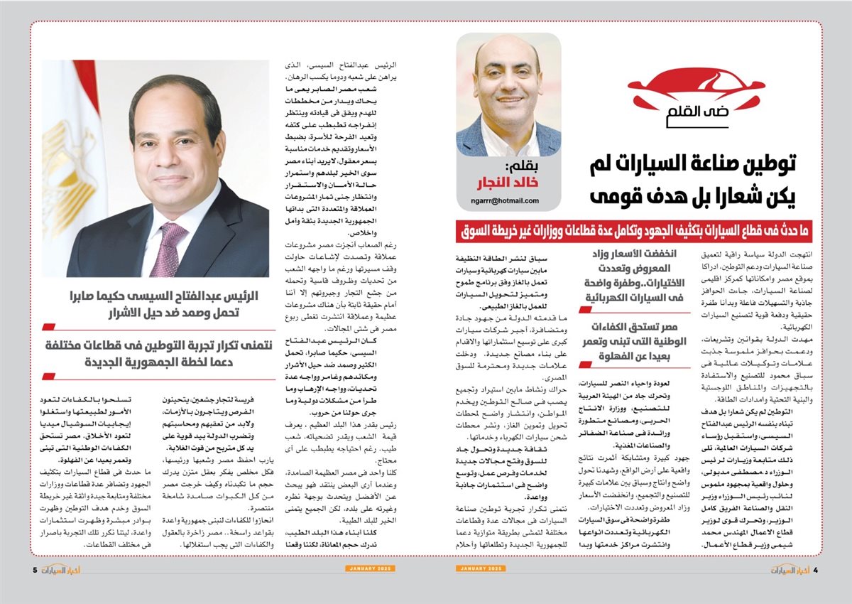 البداية مع مقال الكاتب الصحفي خالد النجار الذي جاء بعنوان "توطين صناعة السيارات لم يكن شعارًا بل هدف قومي"، حيث قال إن الدولة انتهجت سياسة راقية في تعميق صناعة السيارات ودعم التوطين، إدراكا بموقع مصر وإمكاناتها كمركز إقليمي لصناعة السيارات، حيث جاءت الحوافز جاذبة والتسهيلات فاعلة وبدأنا طفرة حقيقية ودفعة قوية لتصنيع السيارات الكهربائية.
