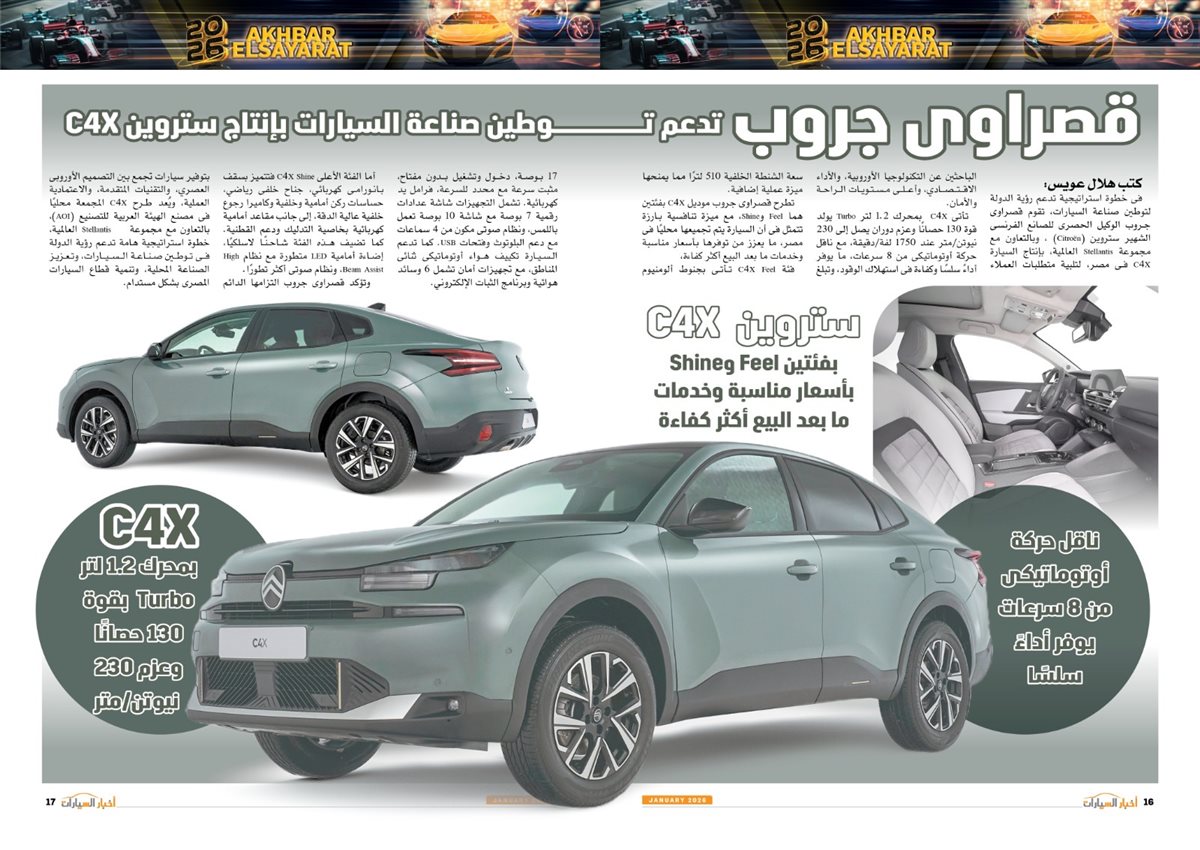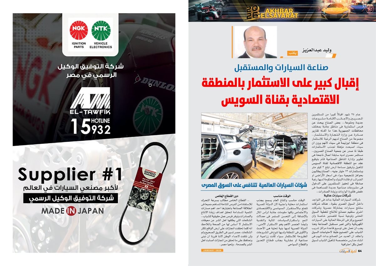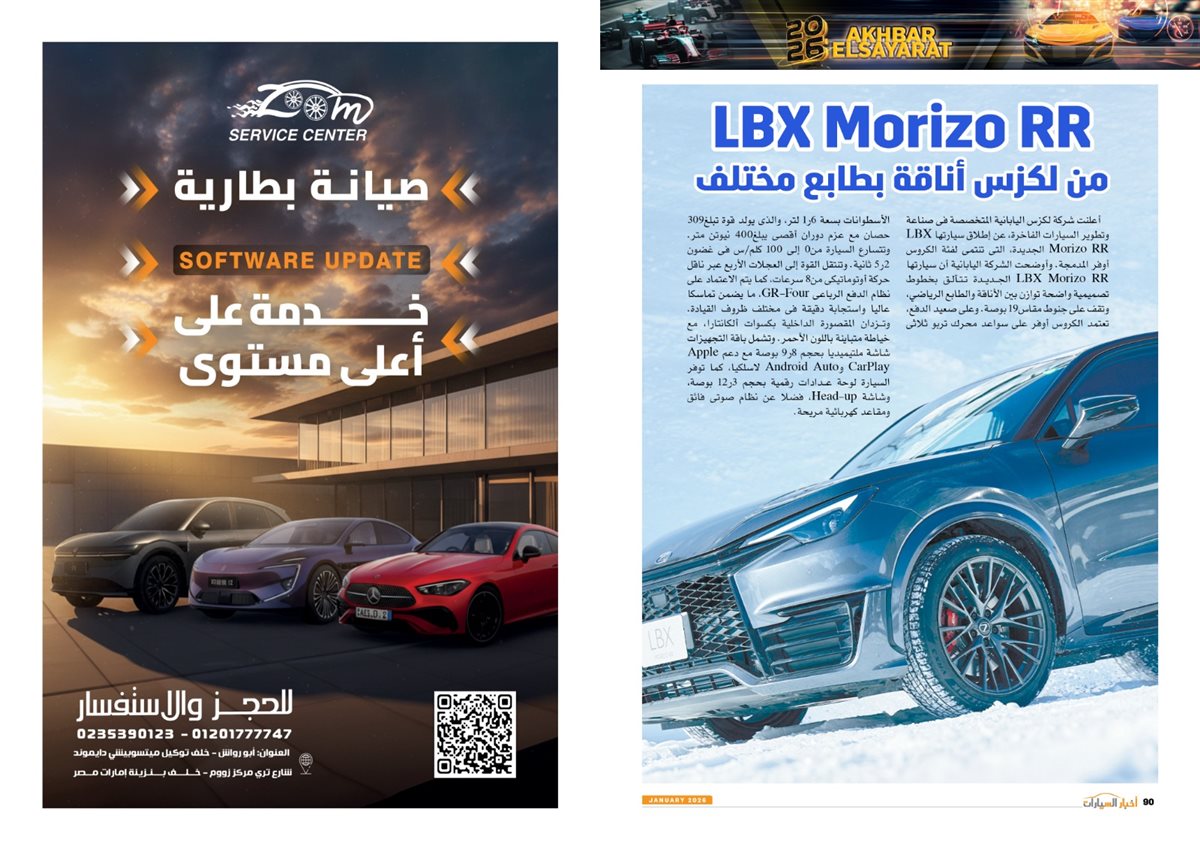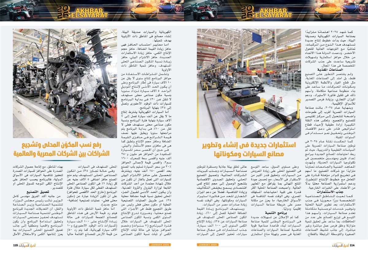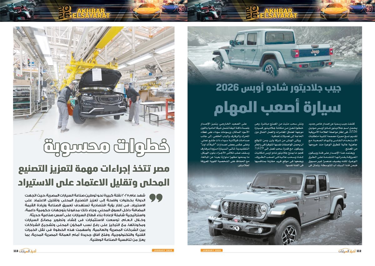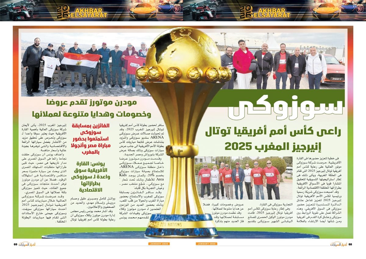 وجاء في العدد أيضًا تقارير عن سوزوكى راعى كأس أمم أفريقيا توتال إنيرجيز المغرب 2025، Gen.Urban من فولكس واجن قادمة بقوة لعالم المنافسة، LBX Morizo RR من لكزس.. أناقة بطابع مختلف، مرسيدس S-Class انطلاقة فى عالم السيارات ذاتية القيادة، كيا تيليورايد 2027.. جرأة تخطف الأنظار، 2026 عامة المنافسة والتصنيع، نصر جديد، مصر تتخذ إجراءات مهمة لتعزيز التصنيع المحلى وتقليل الاعتماد على الاستيراد،