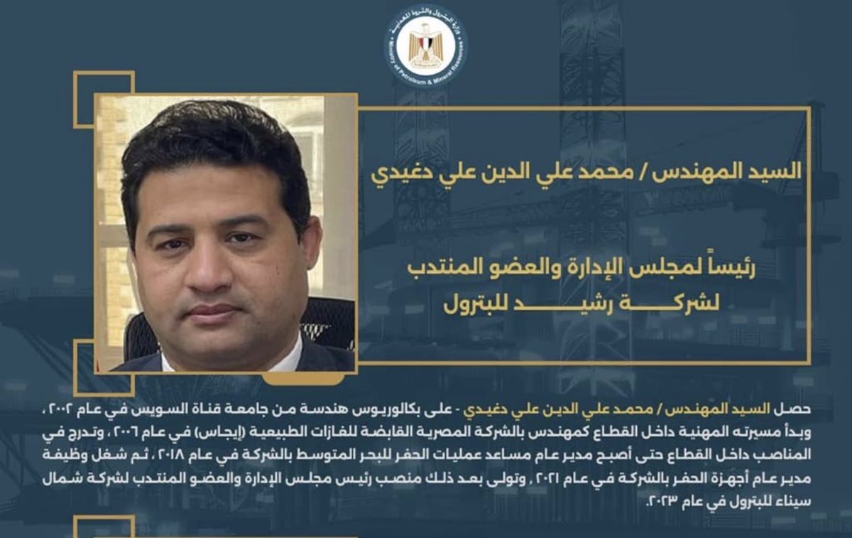 محمد دغيدي رئيساً لشركة رشيد للبترول الأحد 01/فبراير/2026 - 04:10 م 2/1/2026 4:10:58 PM 330 شارك شارك