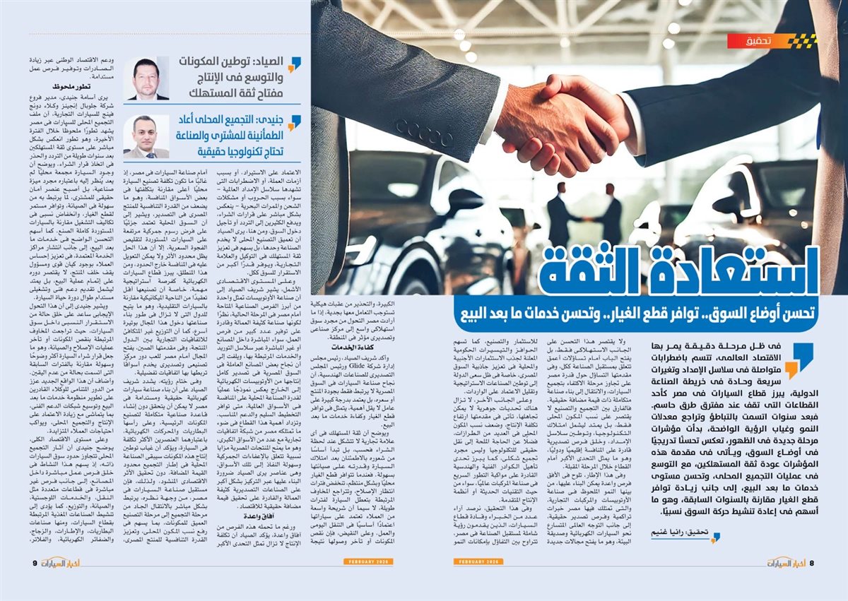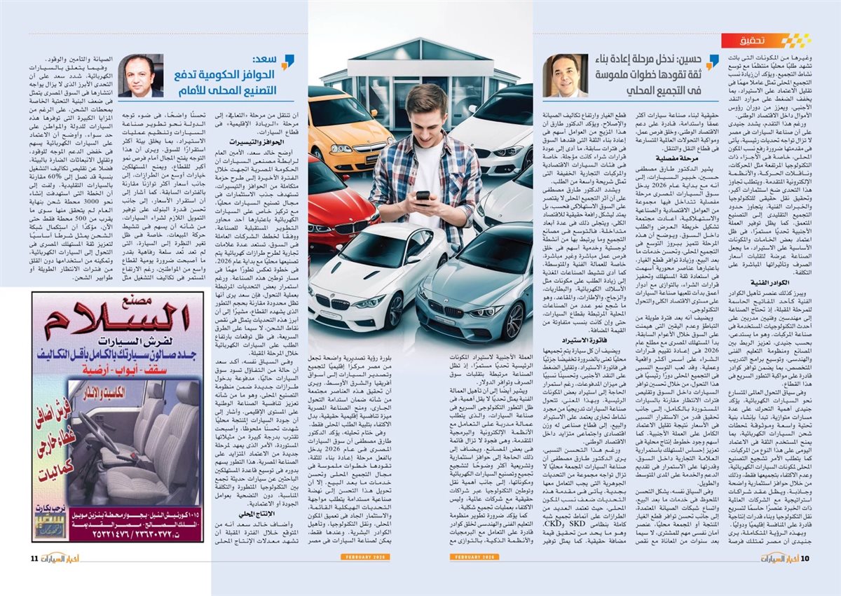 البداية مع مقال الكاتب الصحفي خالد النجار رئيس تحرير مجلة "أخبار السيارات" والذي جاء بعنوان "توطين صناعة السيارات.. استقرار السوق.. وهدوء الأسعار"، حيث قال: تتواصل جهود الدولة، تنفيذًا لتوجيهات الرئيس عبدالفتاح السيسى، لدعم توطين صناعة السيارات.. استراتيجية راقية ودعم حقيقى ومساندة صادقة ظهرت بوادرها بتوافر المعروض وانخفاض الأسعار ودعم منظومة الوقود النظيف تقليلاً للإنفاق ودعما للبيئة النظيفة.