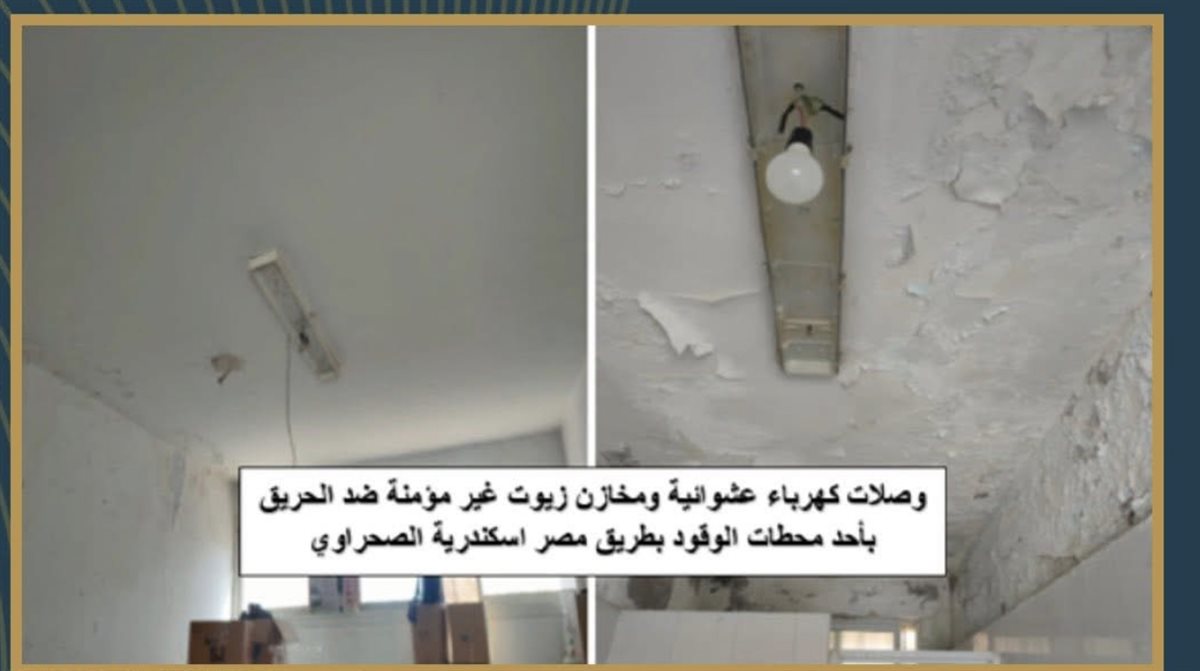 كما تم مراجعة مخزن توزيع أسطوانات بوتاجاز بمركز وادي النطرون، وتبين وجود مخلفات قابلة للاشتعال وتلف مهمات الإطفاء واحتمال سقوط الباب الرئيسي للمخزن لوجود شروخ مع وجود عشوائية في تخزين الاسطوانات ، وتم اخطار الشركة المسئولة لسرعة تلافي الملاحظات.