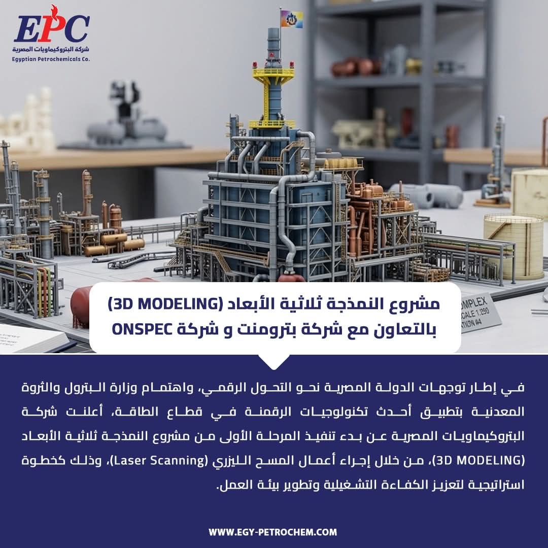 في إطار توجهات الدولة المصرية نحو التحول الرقمي، واهتمام وزارة البترول والثروة المعدنية بتطبيق أحدث تكنولوجيات الرقمنة في قطاع الطاقة، أعلنت شركة البتروكيماويات المصرية عن بدء تنفيذ المرحلة الأولى من مشروع النمذجة ثلاثية الأبعاد (3D Modeling)، من خلال إجراء أعمال المسح الليزري (Laser Scanning)، وذلك كخطوة استراتيجية لتعزيز الكفاءة التشغيلية وتطوير بيئة العمل.