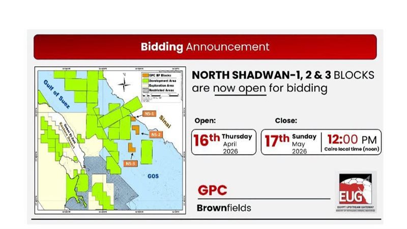 أعلنت الشركة المصرية القابضة لجنوب الوادي للبترول، عبر بوابة مصر للاستكشاف والإنتاج EUG (Egypt Upstream Gateway)، عن طرح مزايدة عالمية جديدة للاستثمار في مجال البحث والاستكشاف بمنطقة خليج السويس، وذلك على ثلاثة بلوكات جديدة بمنطقة شمال شدوان 1 و2 و3. وبحسب الإعلان الرسمي، فإن المزايدة تم فتحها اعتبارًا