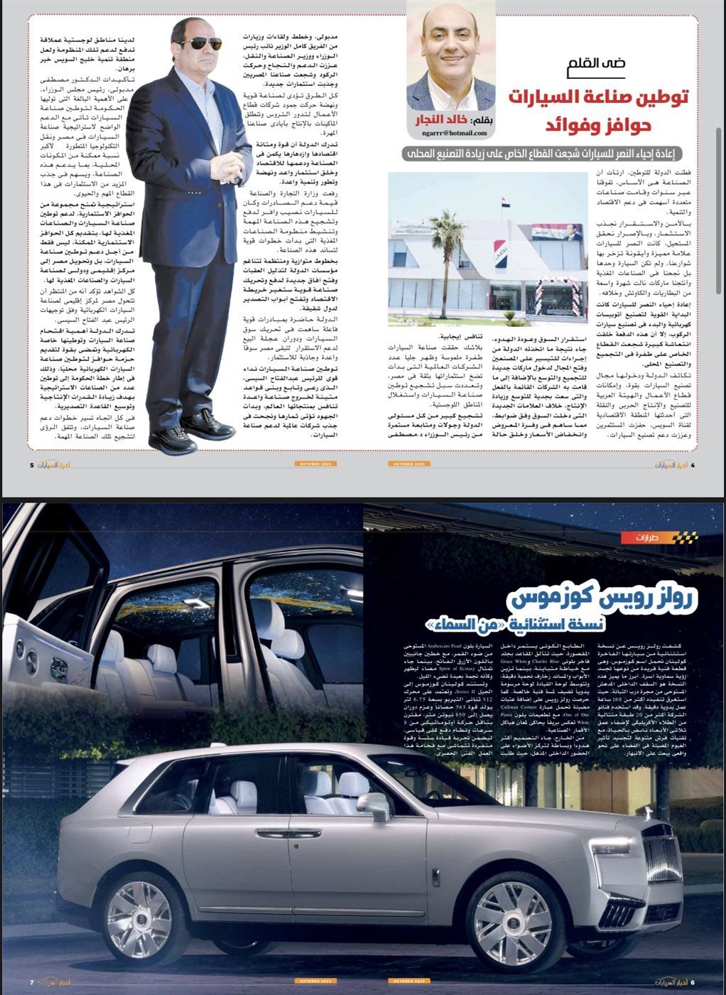 البداية مع مقال الكاتب الصحفي خالد النجار رئيس تحرير مجلة "أخبار السيارات" والذي جاء بعنوان "توطين صناعة السيارات.. حوافز وفوائد"، حيث أكد أن صناعة السيارات حققت طفرة ملموسة وظهر جليا عدد الشركات العالمية التى بدأت تضخ استثماراتها بثقة فى مصر، وتعددت سبل تشجيع توطين صناعة السيارات واستغلال المناطق اللوجستية، وأضاف أن كل الطرق تؤدى لصناعة قوية ونهضة حركت جمود شركات قطاع الأعمال لتدور التروس وتنطلق الماكينات بالإنتاج بأيادى صناعنا المهرة، حيث تدرك الدولة أن قوة ومتانة اقتصادها وازدهارها يكمن فى الصناعة ودعمها لاقتصاد وخلق استثمار واعد ونهضة وتطور وتنمية واعدة.