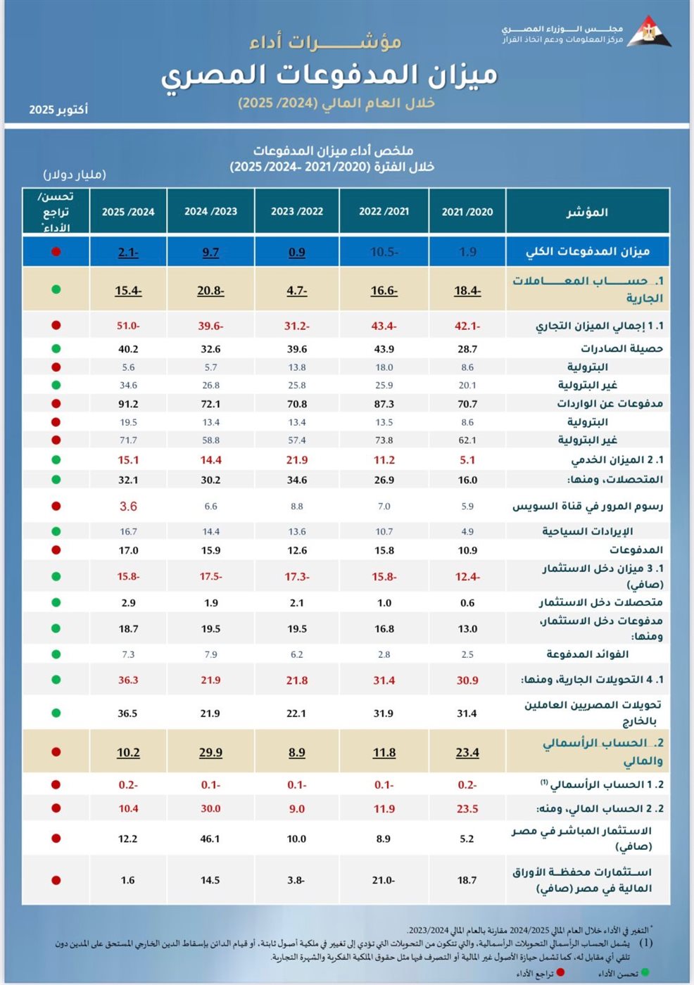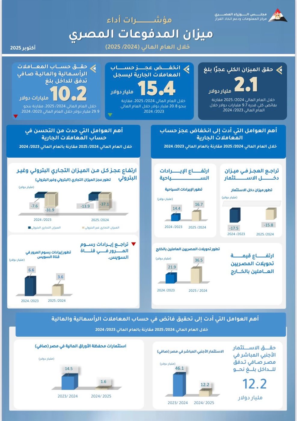 •أبرز نقاط التراجع: عجز الميزان التجاري، تراجع إيرادات قناة السويس، انخفاض استثمارات المحافظ المالية.