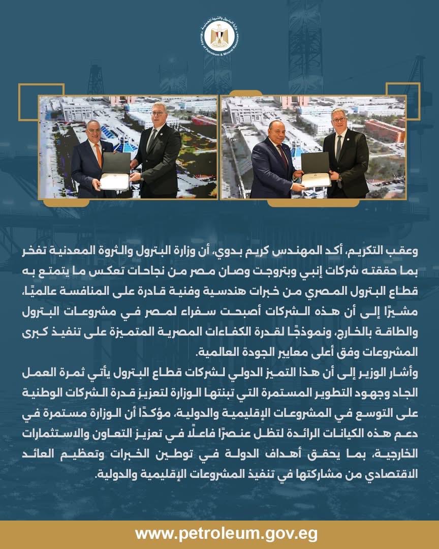 وأكد الوزير خلال التكريم أن ما حققته الشركات الثلاث يعكس ما يتمتع به قطاع البترول المصري من كفاءات هندسية وفنية قادرة على المنافسة عالميًا، مشيرًا إلى أن هذه النجاحات تأتي في إطار استراتيجية الوزارة لتعزيز الحضور الإقليمي للشركات الوطنية ودعم قدرتها على تنفيذ مشروعات عالمية بمعايير الجودة الدولية.