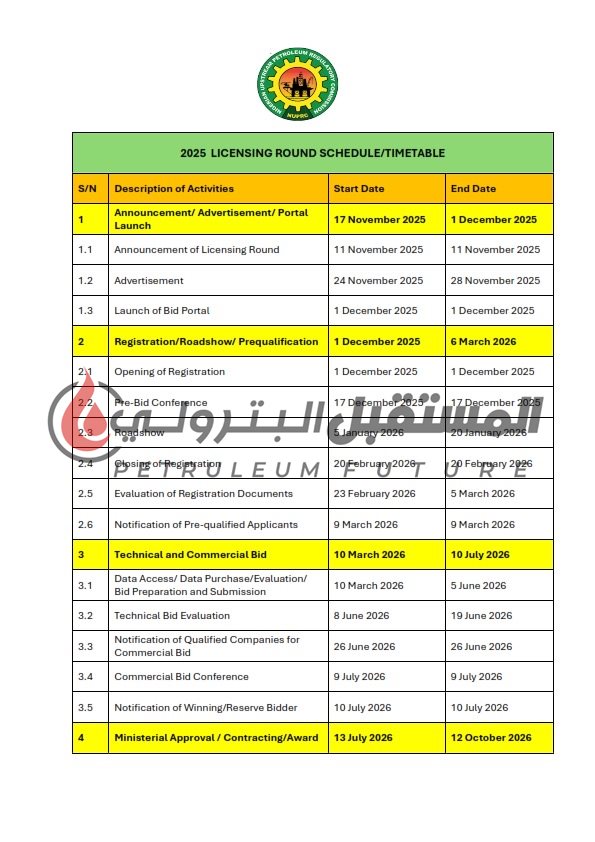في هذا الإطار، أعلنت هيئة تنظيم البترول النيجيرية إطلاق المزايدة العالمية 2025 للاستكشاف والإنتاج، ضمن برنامج يمتد من ديسمبر 2025 إلى أكتوبر 2026، ويشمل مراحل تأهيل وعطاءات فنية وتجارية موجهة للشركات القادرة على تطوير ثروات نيجيريا الهيدروكربونية في واحدة من أغنى مناطق القارة.
