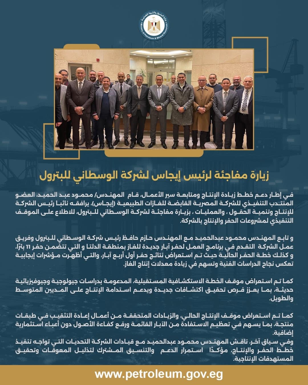 في إطار دعم خطط زيادة الإنتاج ومتابعة سير الأعمال، قام المهندس/ محمود عبد الحميد، العضو المنتدب التنفيذي للشركة المصرية القابضة للغازات الطبيعية (إيجاس)، يرافقه نائبا رئيس الشركة للإنتاج وتنمية الحقول ، والعمليات ، بزيارة مفاجئة لشركة الوسطاني للبترول، للاطلاع على الموقف التنفيذي لمشروعات الحفر والإنتاج بالشركة.