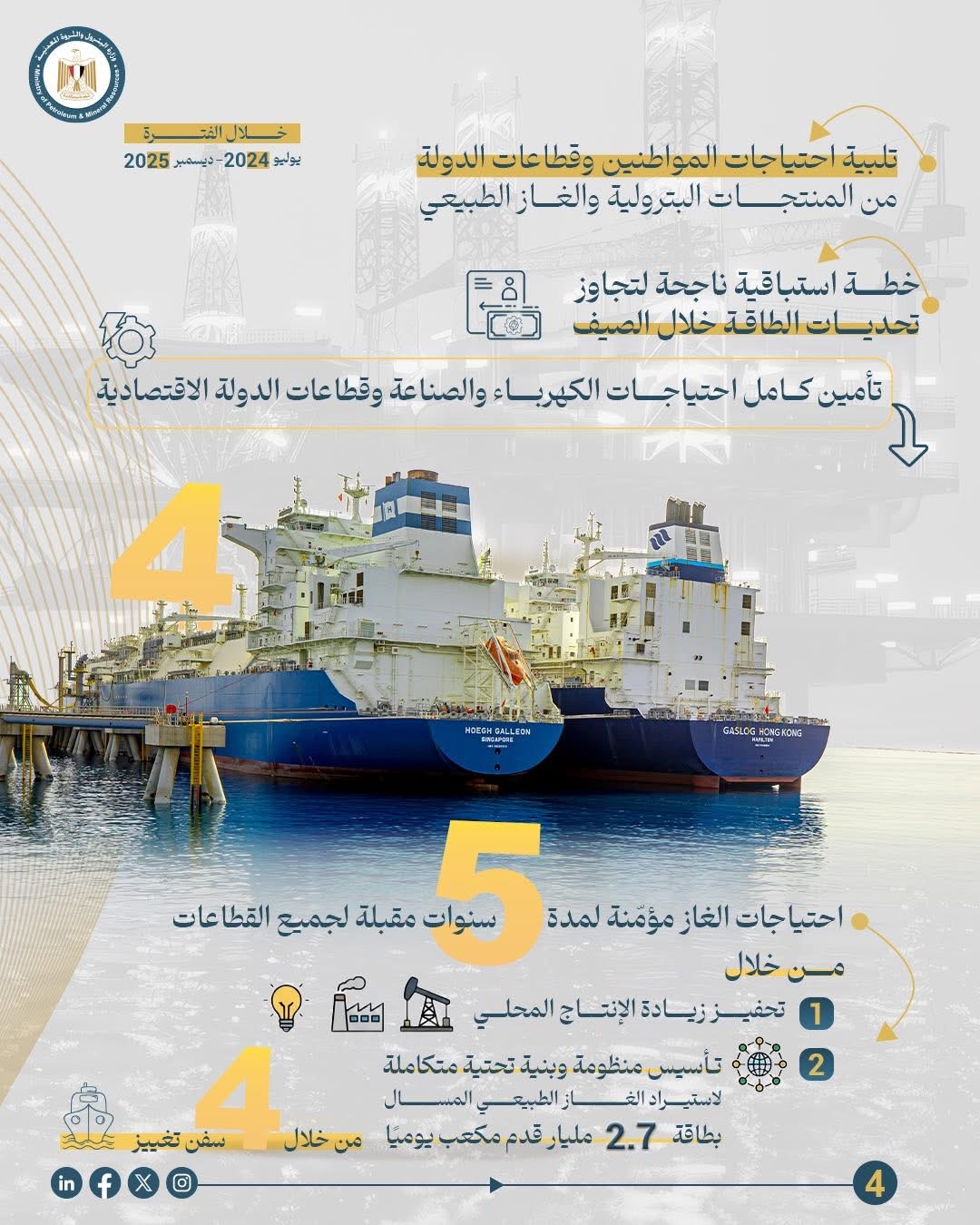 • تنفيذ خطة استباقية ، بدعم من فخامة الرئيس عبدالفتاح السيسي ودولة رئيس مجلس الوزراء الدكتور مصطفى مدبولي ، لتجاوز تحديات الطاقة وتأمين الإمدادات اللازمة لمحطات الكهرباء خلال فصل الصيف ، وتوفير كامل احتياجات قطاع الصناعة وكافة قطاعات الدولة الاقتصادية من الغاز والتي أصبحت مؤمّنة لمدة خمس سنوات مقبلة ، فبالإضافة إلى جهود زيادة الإنتاج المحلى فقد تم تأسيس منظومة وبنية تحتية متكاملة لاستيراد الغاز الطبيعي المسال عبر سفن التغييز، بطاقة تصل إلى 2.7 مليار قدم مكعب يومياً، وبجهود أكثر من 1500 زميل وزميلة من قطاع البترول.