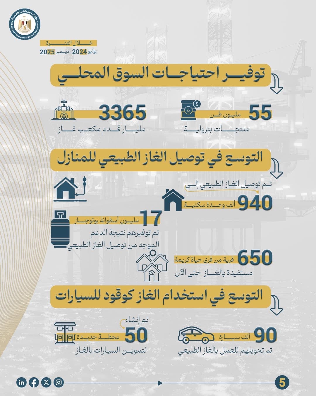 • توفير 55 مليون طن من المنتجات البترولية للاستهلاك المحلى و 3356 مليار قدم مكعب غاز ، كمالتم توصيل الغاز الطبيعى الى 940 الف وحدة سكنية مما ساهم فى توفير 17 مليون اسطوانة بوتاجاز والدعم الموجه لها ، وبلغ عدد قرى حياة كريمة المستفيدة بالغاز الطبيعى اكثر من 650 قرية حتى الآن ، كما تم تحويل 90 الف سيارة للعمل بالغاز الطبيعى وانشاء نحو 50 محطة جديدة لتموين السيارات بالغاز.