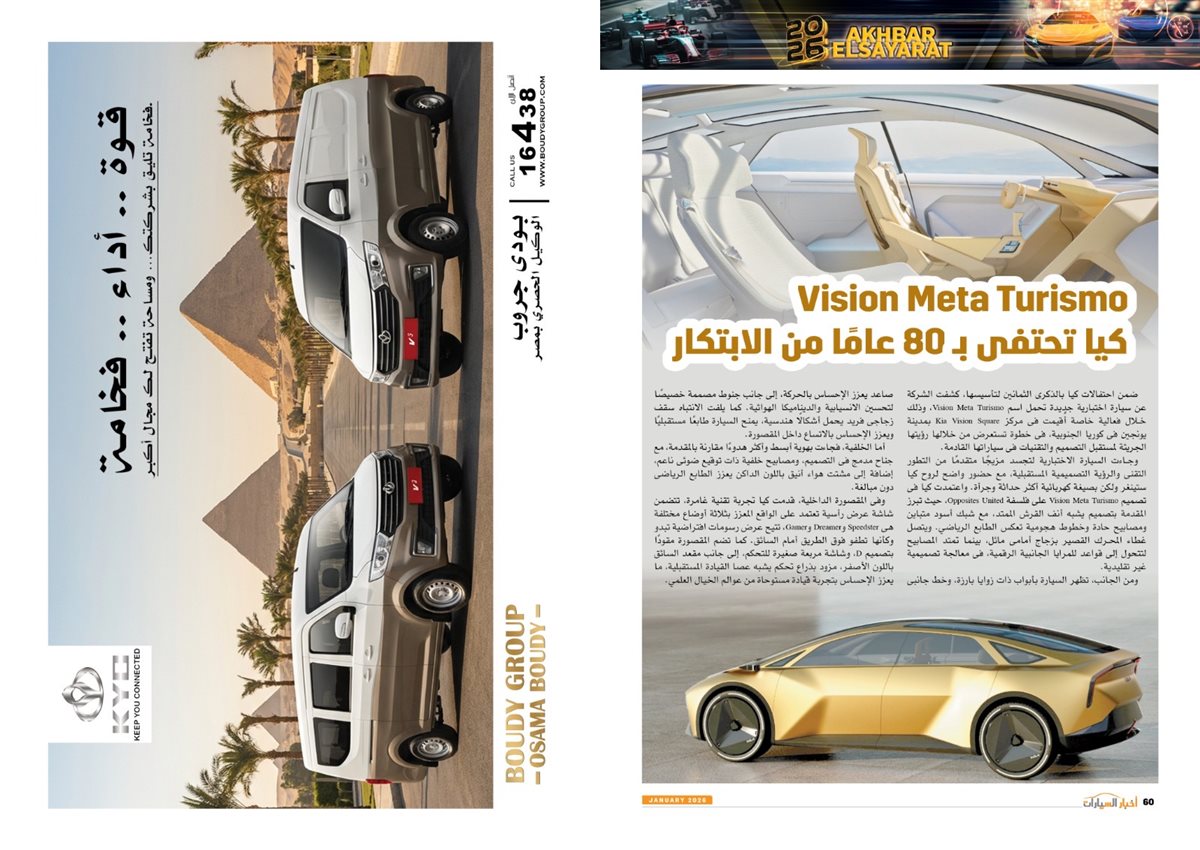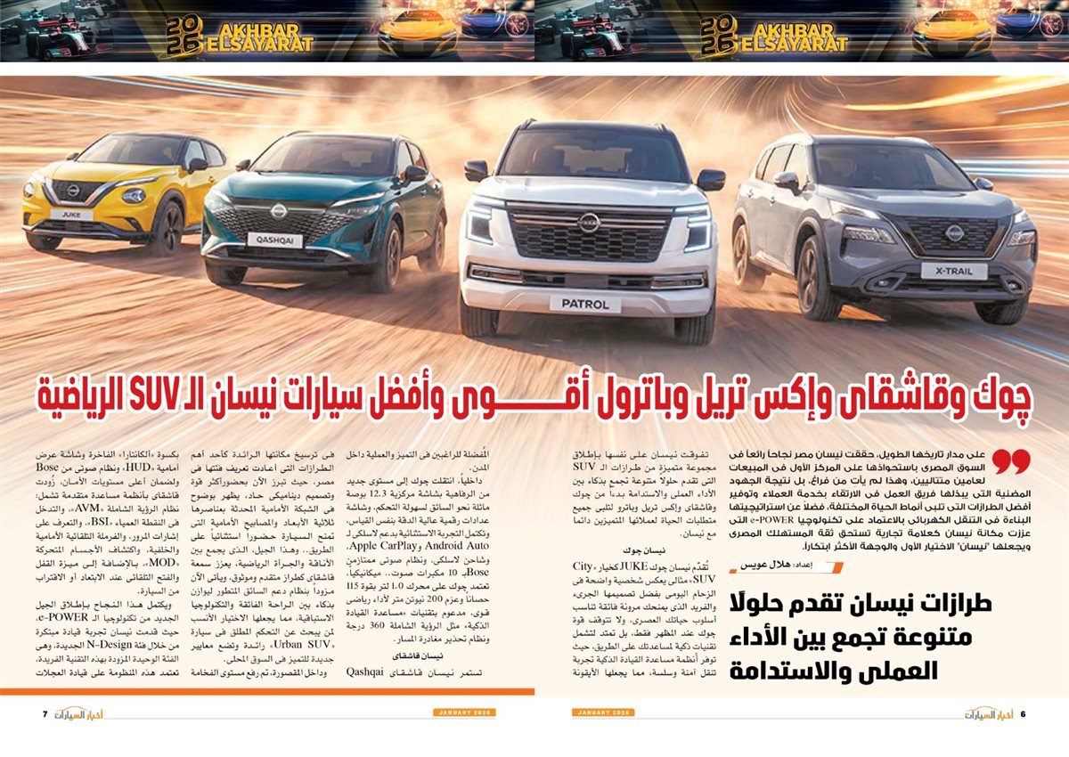ومن بين التقارير المنشورة بالعدد Haval H6.. اهتمام بأدق التفاصيل، چوك وقاشقاى وإكس تريل وباترول أقوى وأفضل سيارات نيسان ال SUV الرياضية، المنصور للسيارات تطلق أوبل جراند لاند الجديدة المصممة والمصنعة فى ألمانيا، قصراوي جروب تدعم توطين صناعة السيارات بإنتاج ستروين C4X، سوزوكي تصميم عصرى ورفاهية بلا حدود، JETOUR أكثر قوة ورفاهية مع قصراوى جروب، Vision Meta Turismo كيا تحتفى ب 80 عامًا من الابتكار.