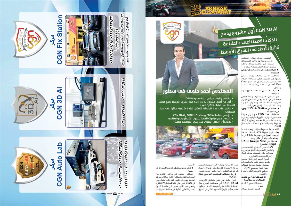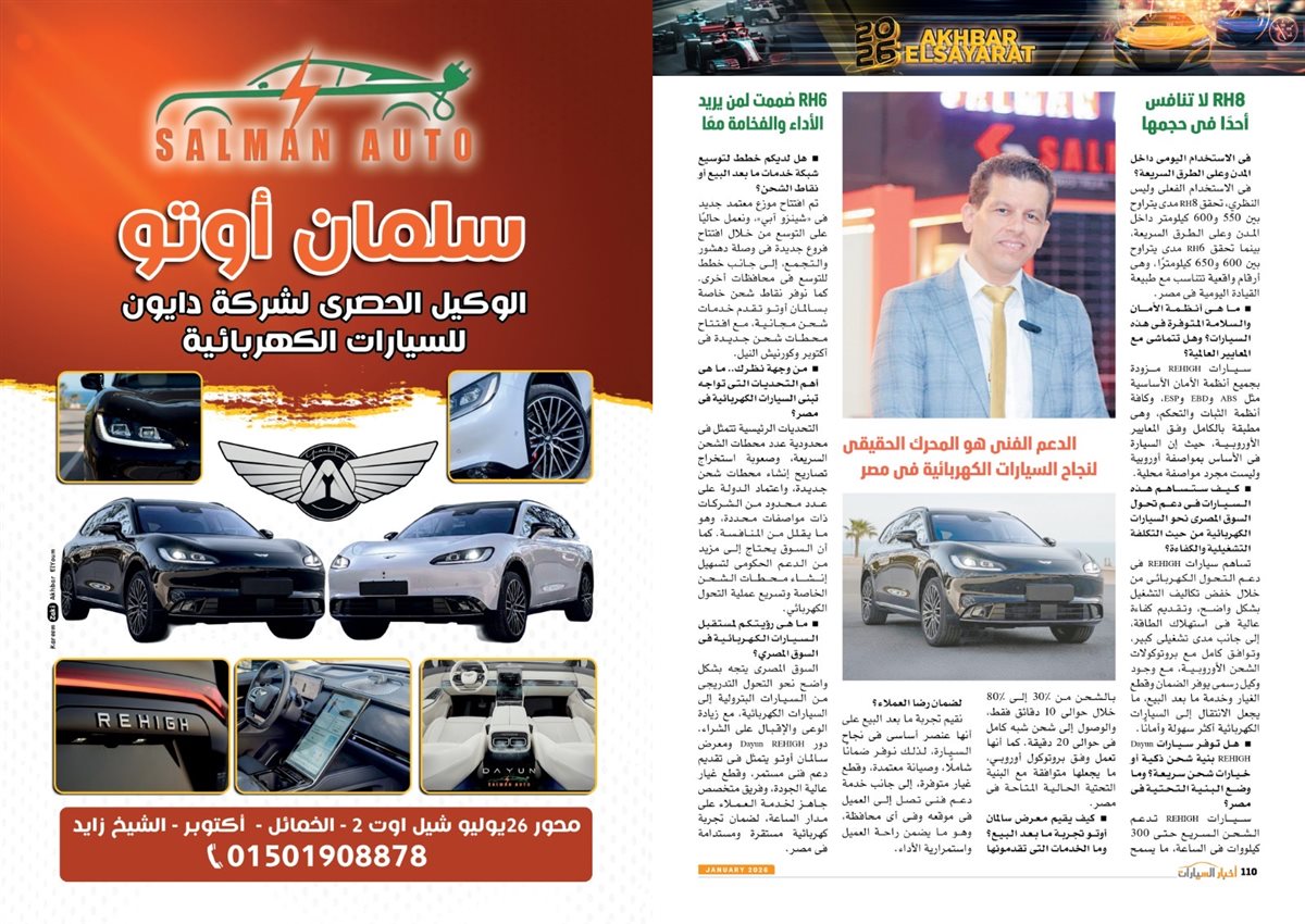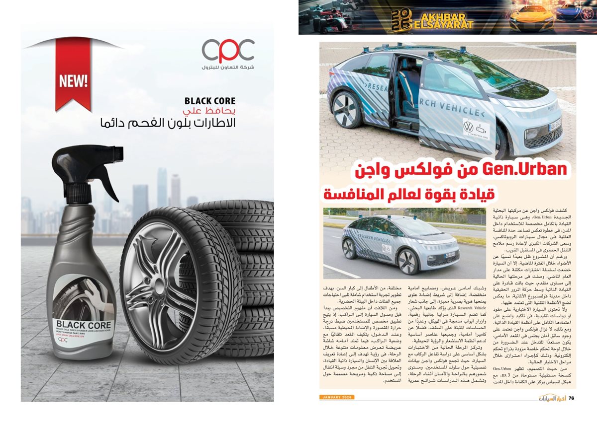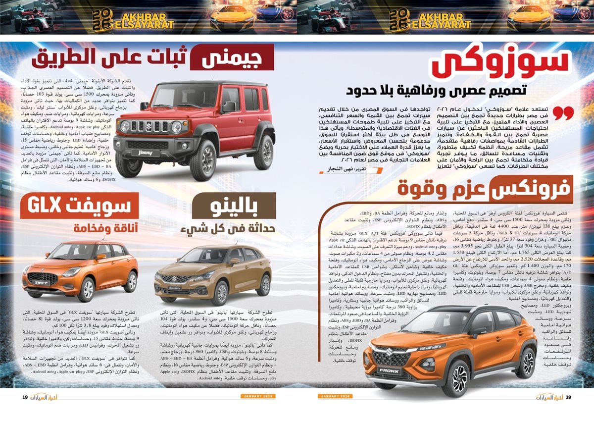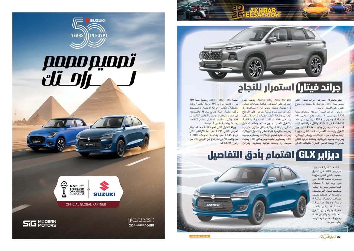وجاء في العدد أيضًا تقارير عن سوزوكى راعى كأس أمم أفريقيا توتال إنيرجيز المغرب 2025، Gen.Urban من فولكس واجن قادمة بقوة لعالم المنافسة، LBX Morizo RR من لكزس.. أناقة بطابع مختلف، مرسيدس S-Class انطلاقة فى عالم السيارات ذاتية القيادة، كيا تيليورايد 2027.. جرأة تخطف الأنظار، 2026 عامة المنافسة والتصنيع، نصر جديد، مصر تتخذ إجراءات مهمة لتعزيز التصنيع المحلى وتقليل الاعتماد على الاستيراد،