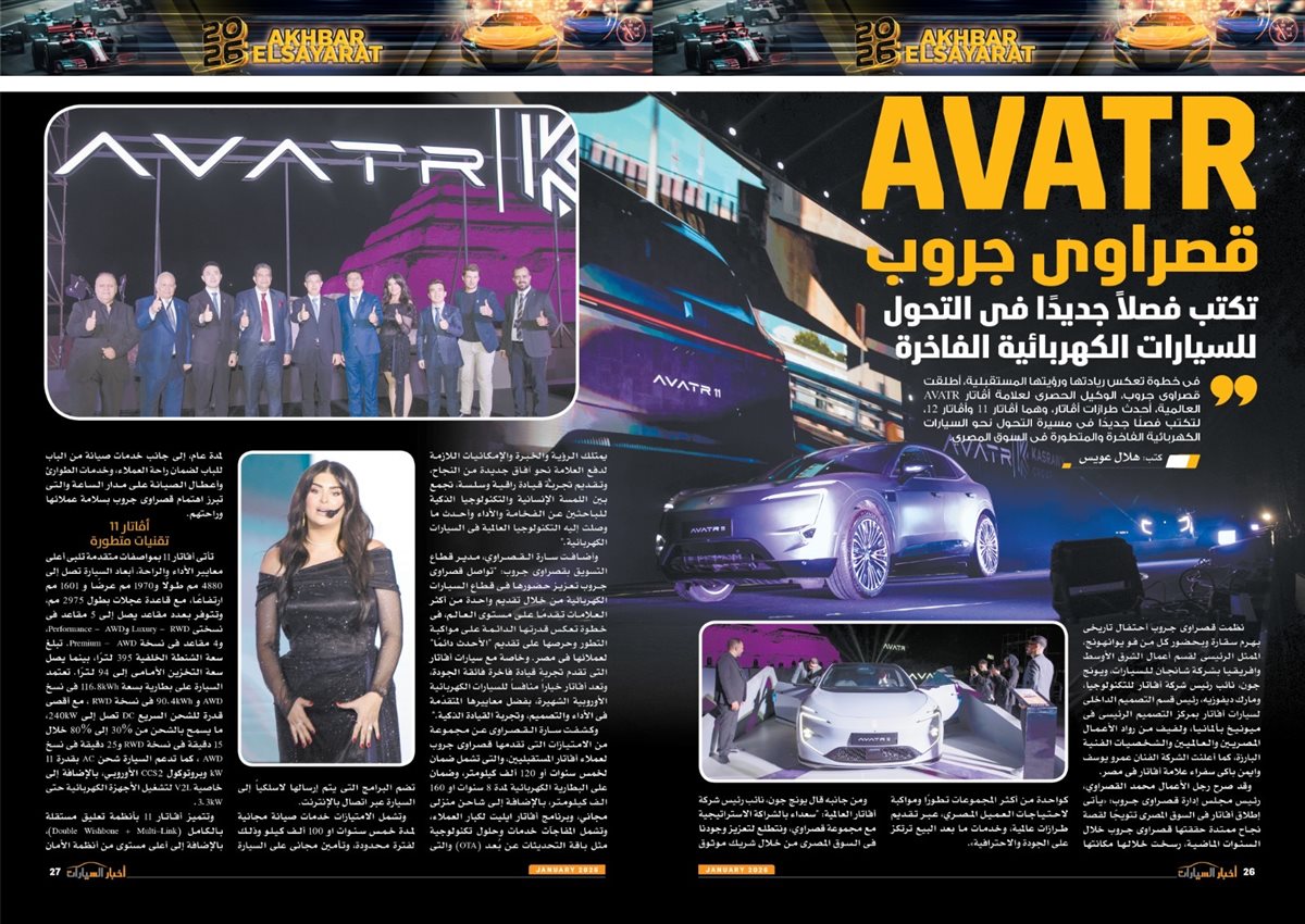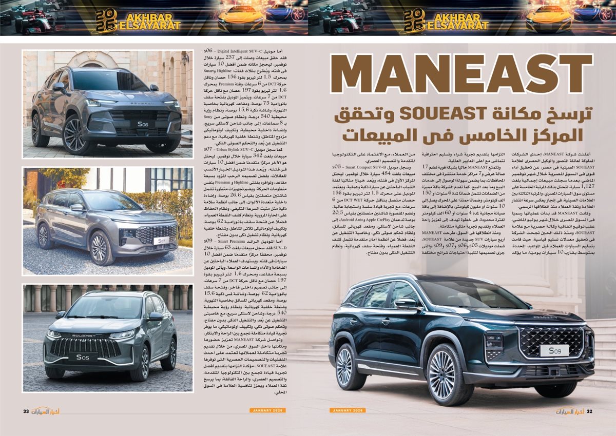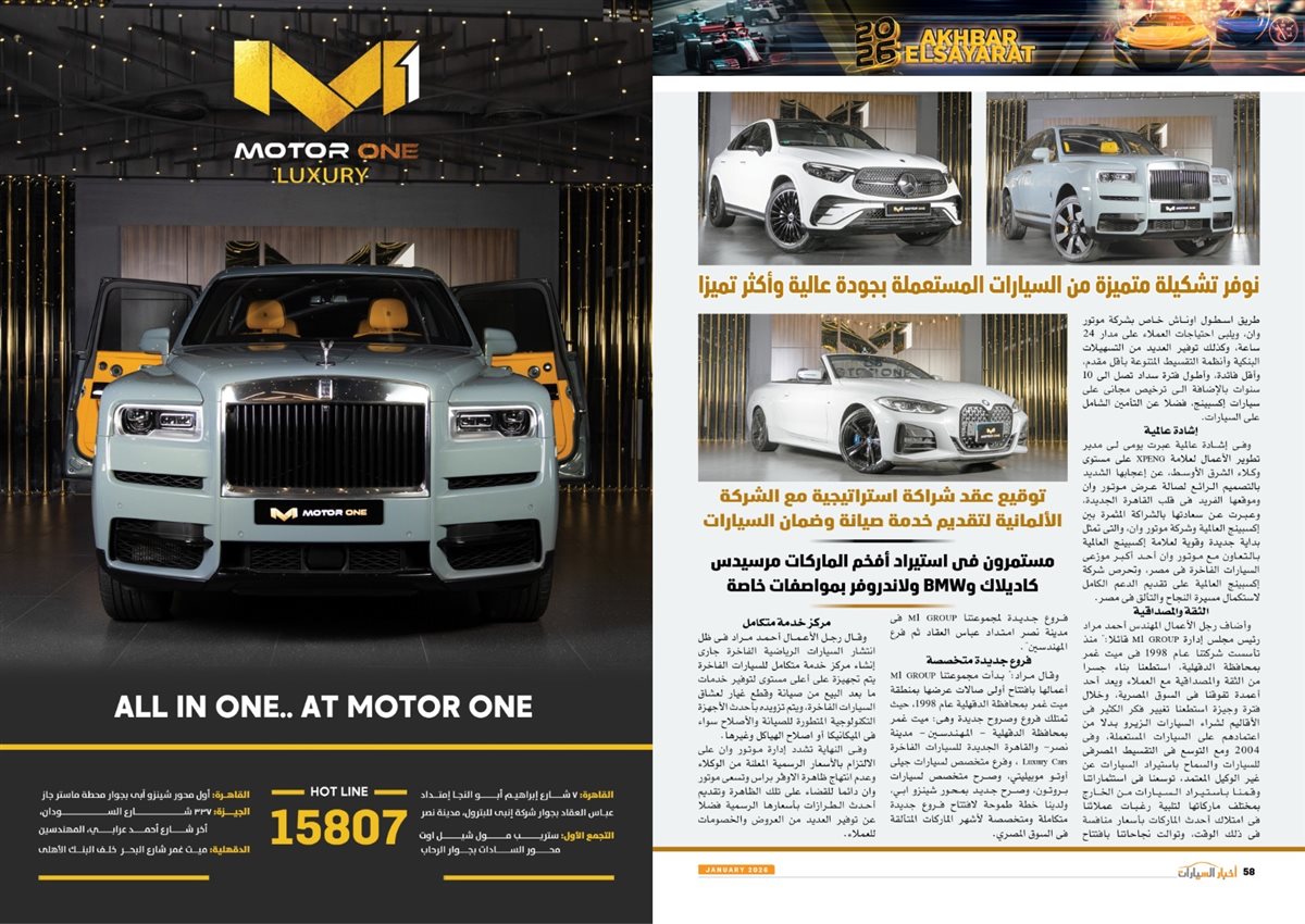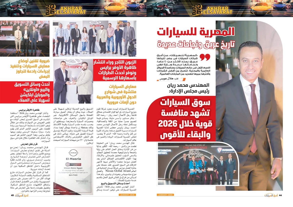 وضم العدد أيضًا تقارير بعنوان قصراوي جروب تبدأ فضلا جديدا في التحول للسيارات الكهربائية الفاخرة، MANEAST ترسخ مكانة SOUEAST وتحقق المركز الخامس فى المبيعات، FBB MOTORS تحتفل بإطلاق «هونشى - »HONGQI للسيارات الفاخرة، ألفا روميو مصر تعلن عمرو نصوحى سفيرًا رسميًا للعلامة فى السوق المصرية، Astra.. تصميم أكثر عصرية من أوبل، شل للزيوت مصر وحسن علام القابضة شراكة استرتيجية لمدة 5 سنوات، motor one 28 عاما من النجاح والتفوق، بودى جروب تعلن مرحلة الانطلاقة الكبرى فى 2026.