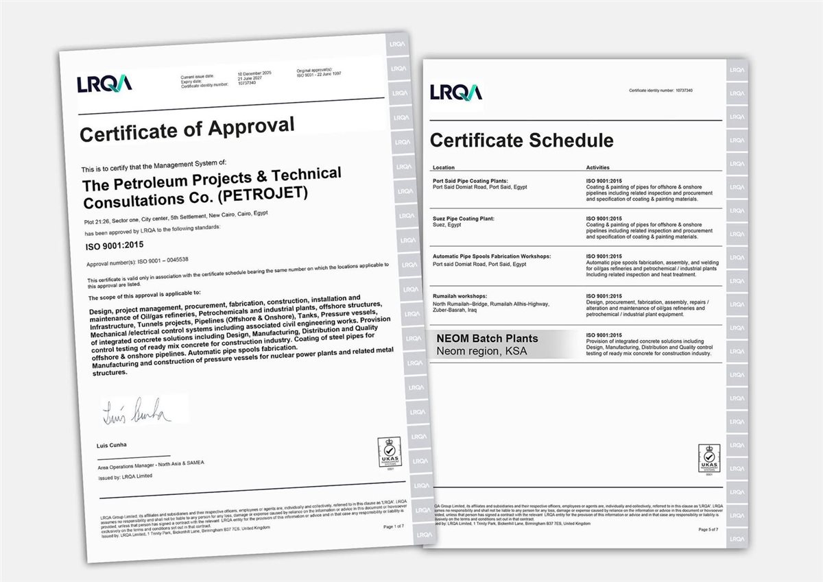 في إطار التزامها المستمر بالتطوير وتعزيز قدرتها التنافسية عالميًا، نجحت PETROJET في الحصول على شهادة ISO 9001 لأنشطة إنتاج الخرسانة الخاصة بها في المملكة العربية السعودية.