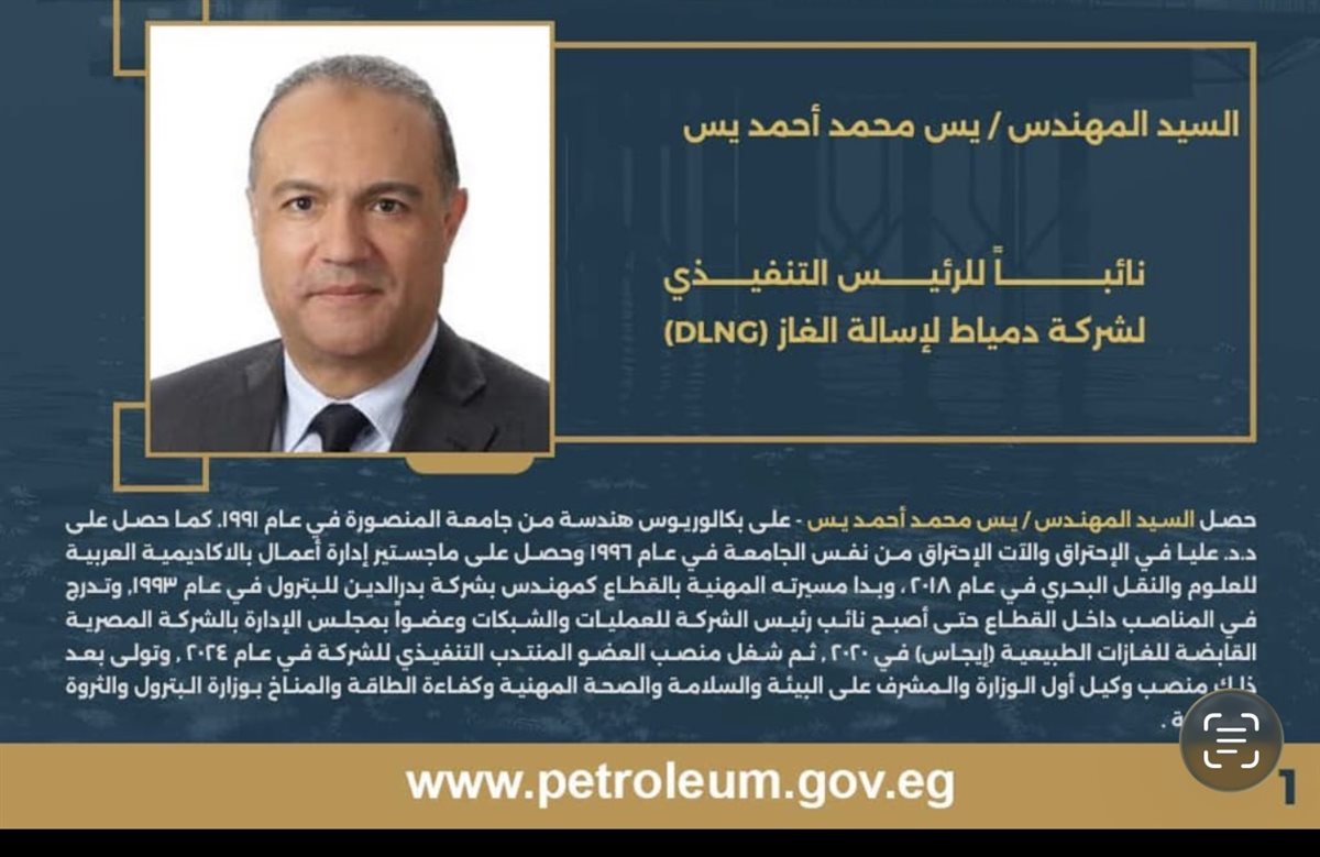 يس محمد نائباً لرئيس شركة دمياط لإسالة الغاز الأحد 01/فبراير/2026 - 04:35 م 2/1/2026 4:35:53 PM 934 شارك شارك