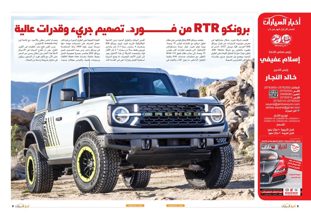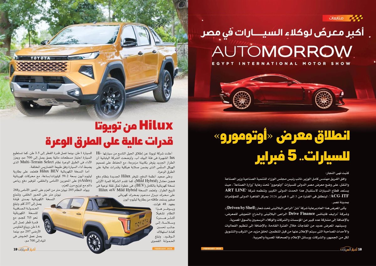 وضم العدد مجموعة من التقارير منها رينو فيلانتي.. الفخامة بمفهومها الكامل، هيونداي تطلق Ioniq 6 الكهربائية.. الأكثر رشاقة وحداثة، برونكو RTR من فورد.. تصميم جريء وقدرات عالية، ثورة النقل الكهربائى، استعادة الثقة، مرسيدس S-Class موديل 2027 مفاجأة لعشاق الفخامة، روشتة الأمان في رمضان، «نصر »EV .. بين أهرامات الجيزة، انطلاق معرض «أوتومورو» للسيارات.. 5 فبراير، وHilux من تويوتا.. قدرات عالية على الطرق الوعرة.