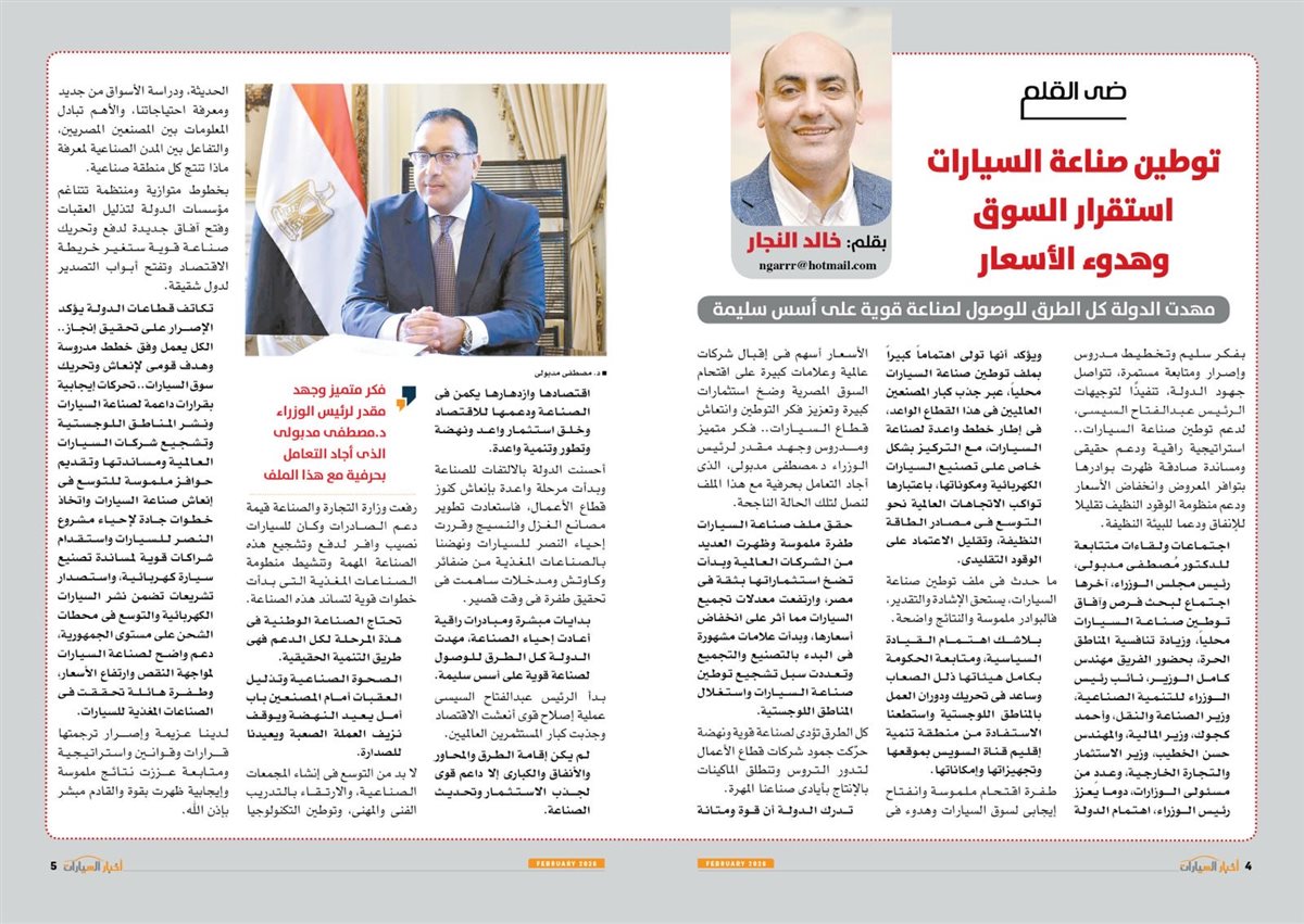 البداية مع مقال الكاتب الصحفي خالد النجار رئيس تحرير مجلة "أخبار السيارات" والذي جاء بعنوان "توطين صناعة السيارات.. استقرار السوق.. وهدوء الأسعار"، حيث قال: تتواصل جهود الدولة، تنفيذًا لتوجيهات الرئيس عبدالفتاح السيسى، لدعم توطين صناعة السيارات.. استراتيجية راقية ودعم حقيقى ومساندة صادقة ظهرت بوادرها بتوافر المعروض وانخفاض الأسعار ودعم منظومة الوقود النظيف تقليلاً للإنفاق ودعما للبيئة النظيفة.