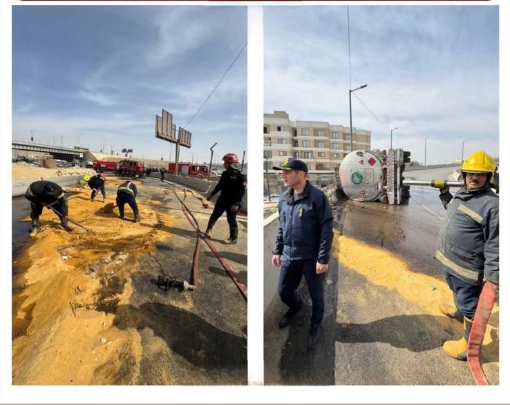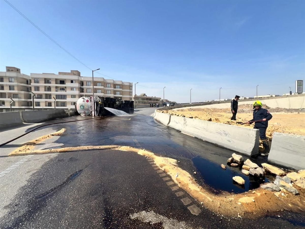 كما قامت فرق الطوارئ بتنفيذ مسارات بالرمل لاحتواء وصرف المادة البترولية المنسكبة، ومنع امتدادها إلى نهر الطريق أو وصولها إلى مصادر اشتعال، في إطار الإجراءات الوقائية المتبعة لتفادي أي مخاطر محتملة.
