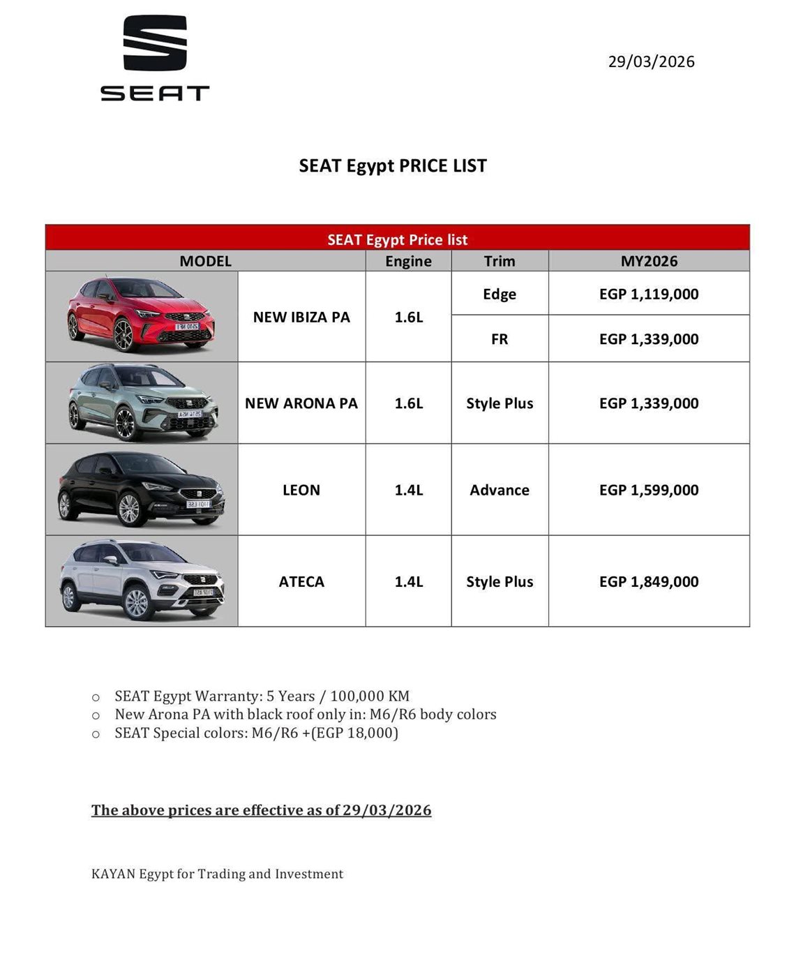 وقفز سعر السيارة سيات ليون إلى مليون و600 ألف جنيه، بدلًا من مليون و475 ألف جنيه، لتصعد 125 ألف جنيه.